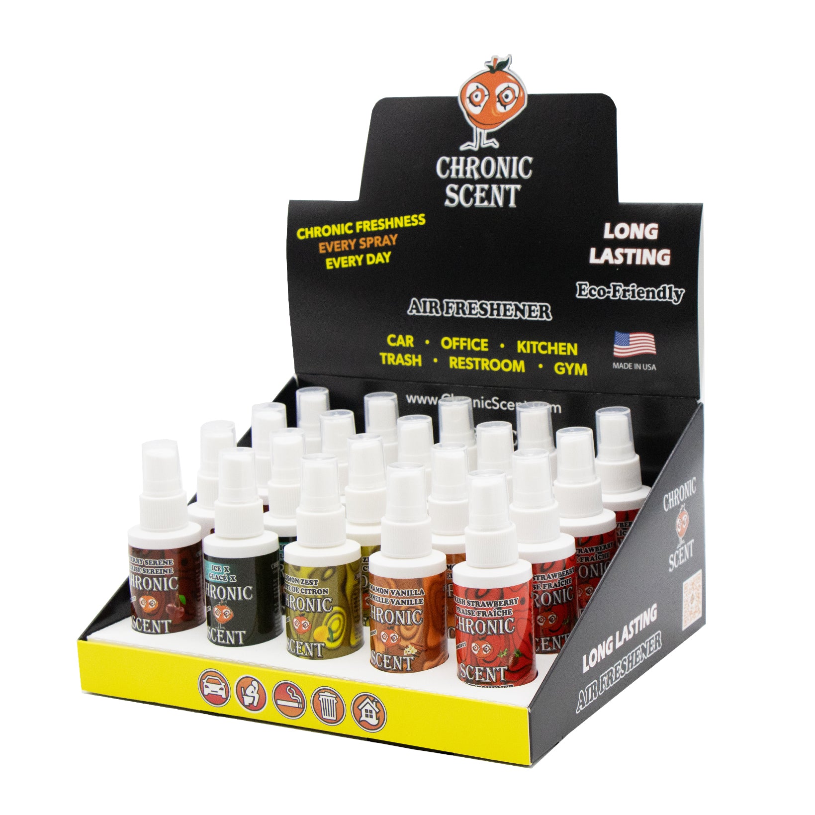 Éliminez la fumée avec le désodorisant Orange Chronic, extrait d'oranges fraîches de Californie. Ce désodorisant à l'odeur amusante contient plus de 600 pulvérisations et est pratique à emporter partout et laissera n'importe quelle voiture ou pièce avec une odeur d'orange fraîchement tranchée.